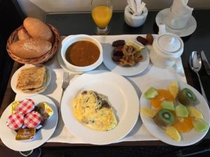 This morning I had a traditional Moroccan breakfast: fresh fruit, a mushroom omelet, a bowl of harira (a tomato based lentil soup that you squeeze lemon juice into) dates, a pastry of fried dough dipped in honey and covered with sesame seeds, three Moroccan pancakes served with butter and jam and several loaves of Moroccan bread which is shaped and used like pita but is made with barley flour and is doughy. Also, sweet black coffee and fresh orange juice.